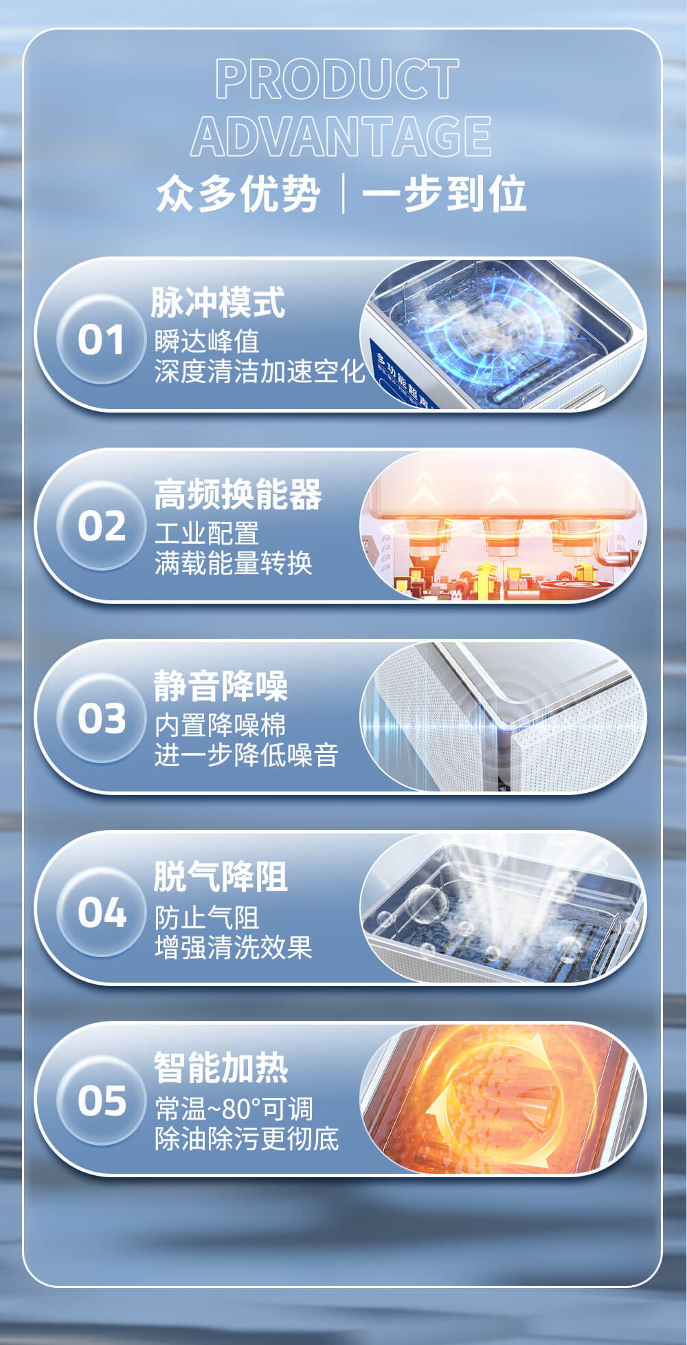 - 自主控制功能:具備功率可調、溫度可調、時間可調等功能,滿足不同物品的清洗要求。