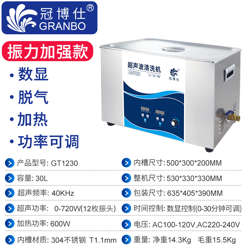冠博仕GT1230超聲波清洗機|30L/720W|功率可調數碼定時帶加熱脫氣