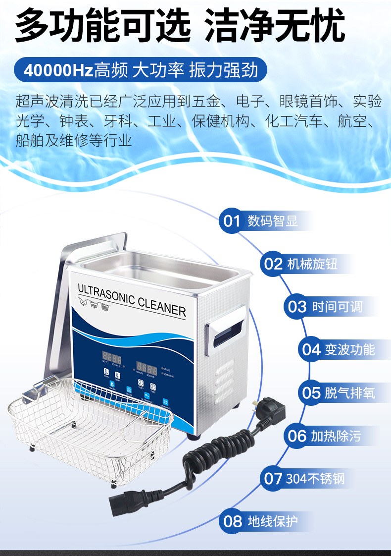 1.家用適用范圍:清潔高檔手表、品牌眼鏡、珠寶首飾等貴重物品和表鏈、水筆、光碟、刮須刀、梳子、牙刷、假牙、 茶具還有奶瓶、 奶嘴具等各類日用品,以及清洗水果、蔬菜、魚肉、碗碟筷等。